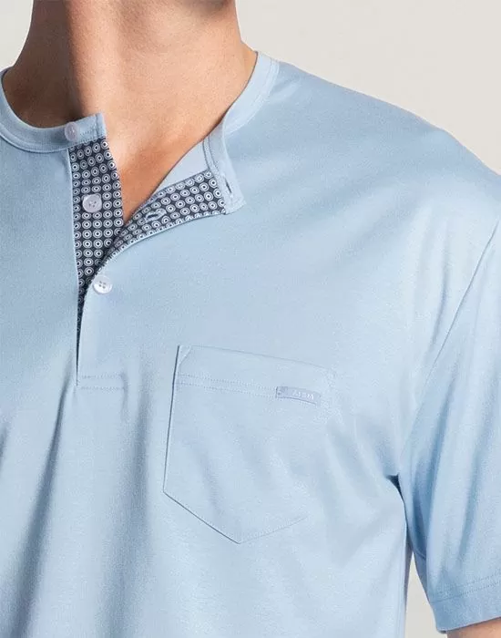 - Ensfarget overdel med korte ermer og knappestolpe