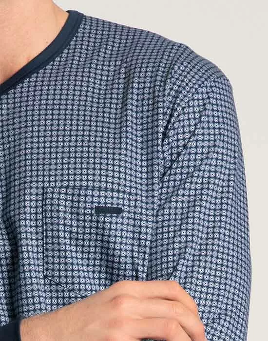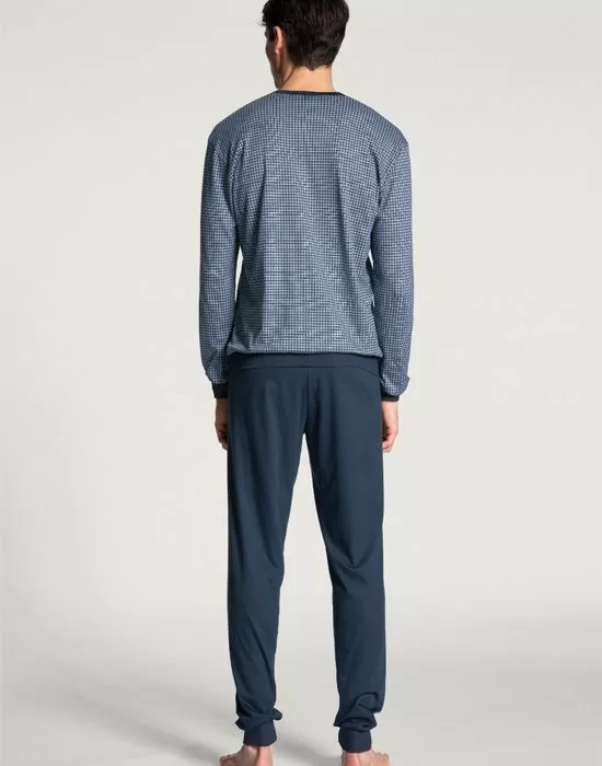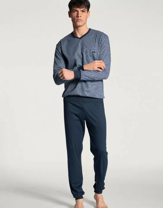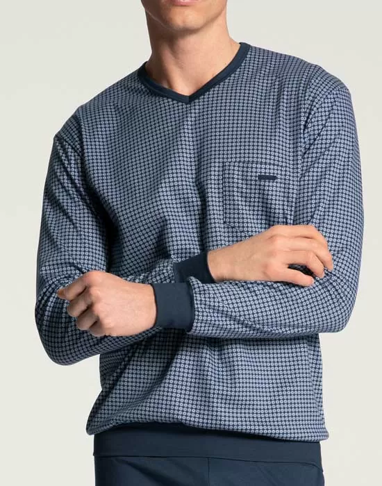 - Ensfarget bukse og blåmønstrete genser med V-hals.