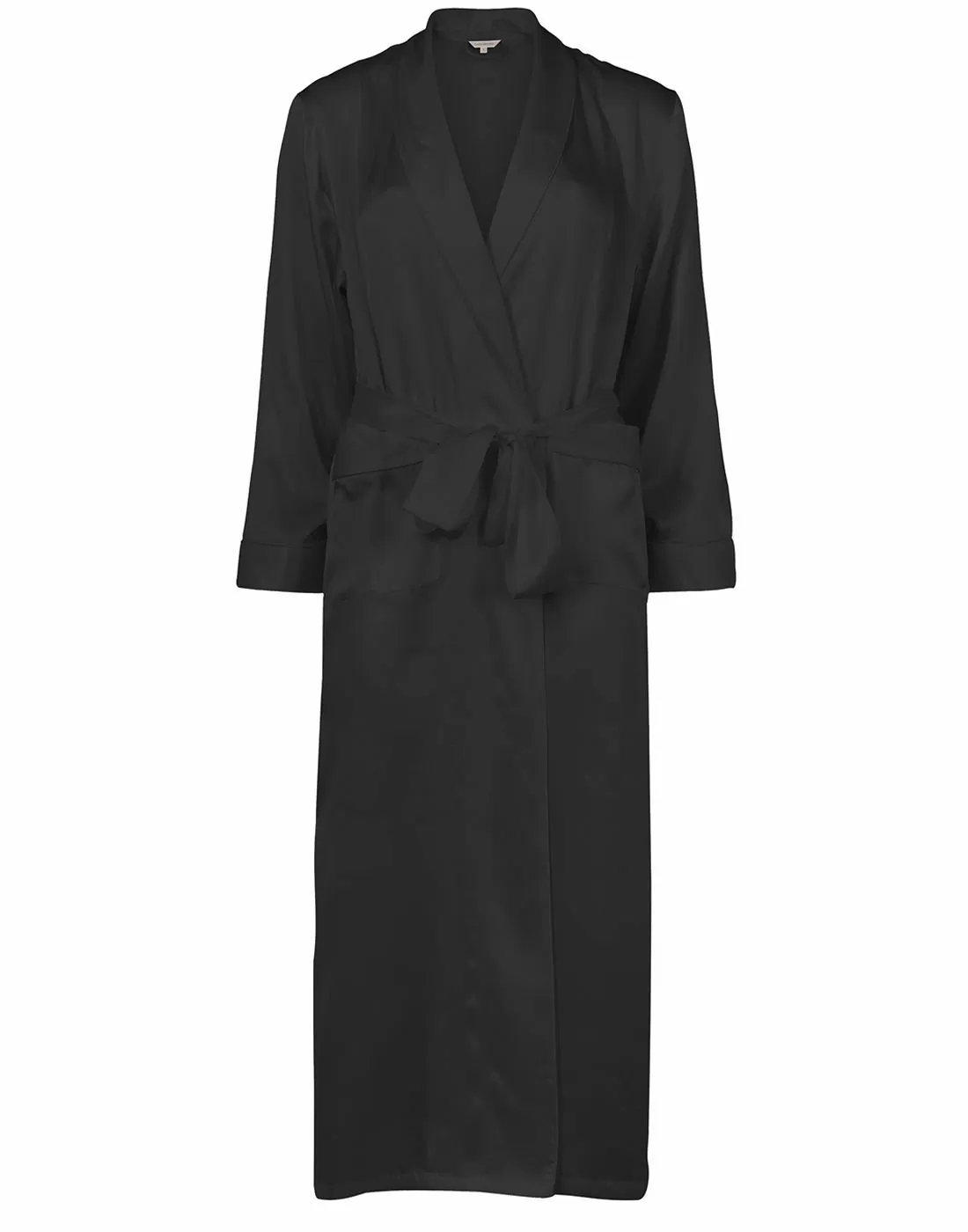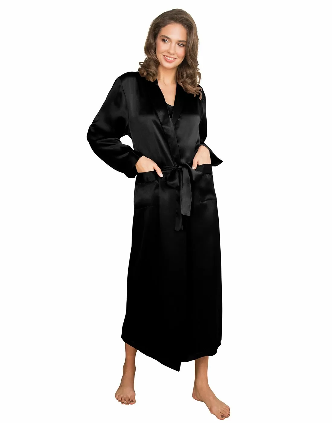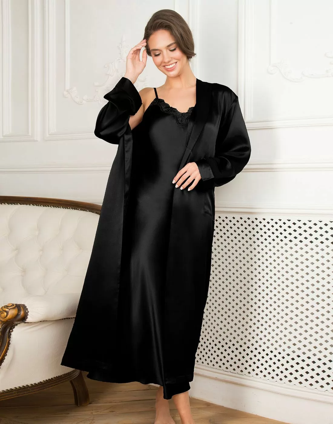 • Lang morgenkåpe i 100 % silke og klassisk sort